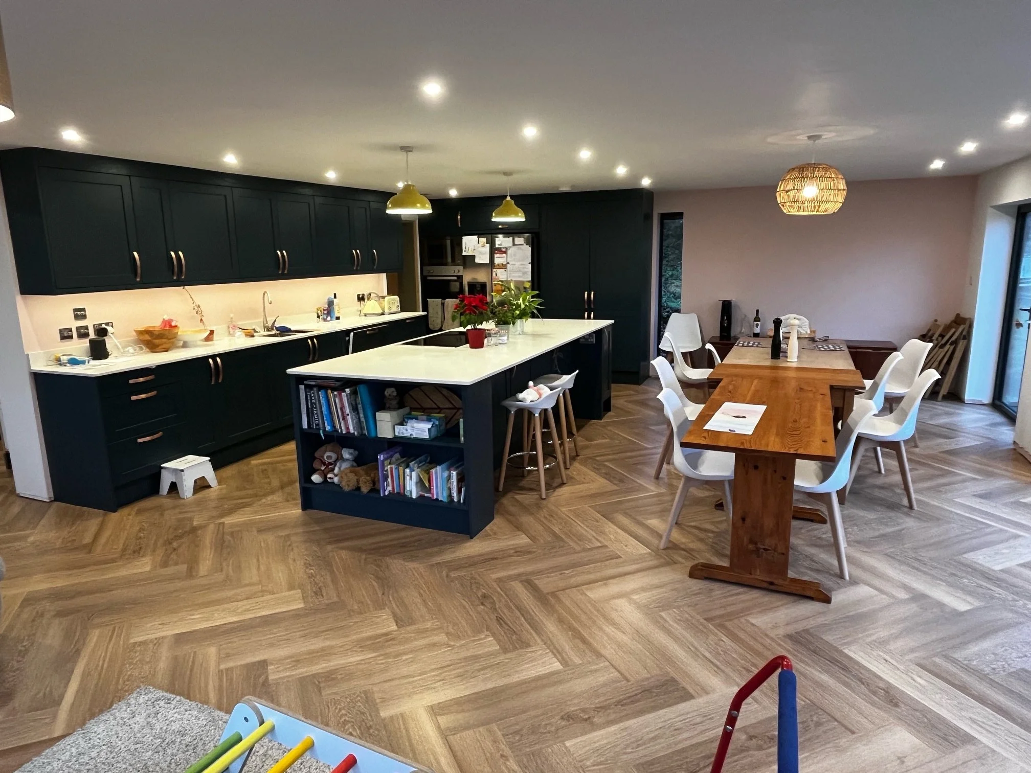 The brief was to refurbish the whole basement area to create a children’s play space, guest shower room, utility room, study area and kitchen/dining area.