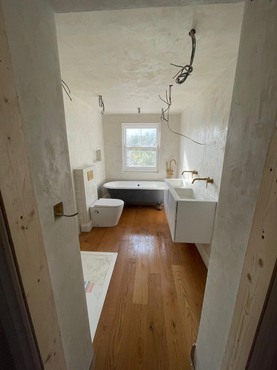 The external walls of the extension shall be built of matching brickwork, which will be exposed on one side internally. The roofs of this extension and the bathroom above shall be flat and clad in lead, with gulley at the party-wall side.