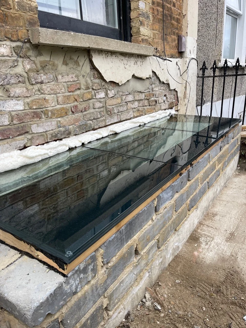 The new light-well at the front shall be finished with white render and the new basement hallway will be of matching brickwork and have a timber panelled door. The new staircase leading to be basement shall be of black cast iron and selected to be in keeping with the existing front door handrail. The new window for the playroom in the basement at the front shall be another sash window- but squarer in proportion to reflect the basement location, with taller sash windows above.