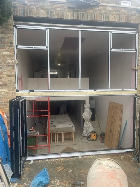 The façade of the extension will be broken with aluminium frames to be painted grey and will reflect the industrial character mentioned above- but with a minimalistic composition to allow a better sense of openness. The rear elevations windows are to be replaced with new timber sash windows. The existing rear stair window (that currently sits on the first floor landing) will be replaced by a raised and open-able, taller and thinner, timber window to light the staircase up to the first floor.
