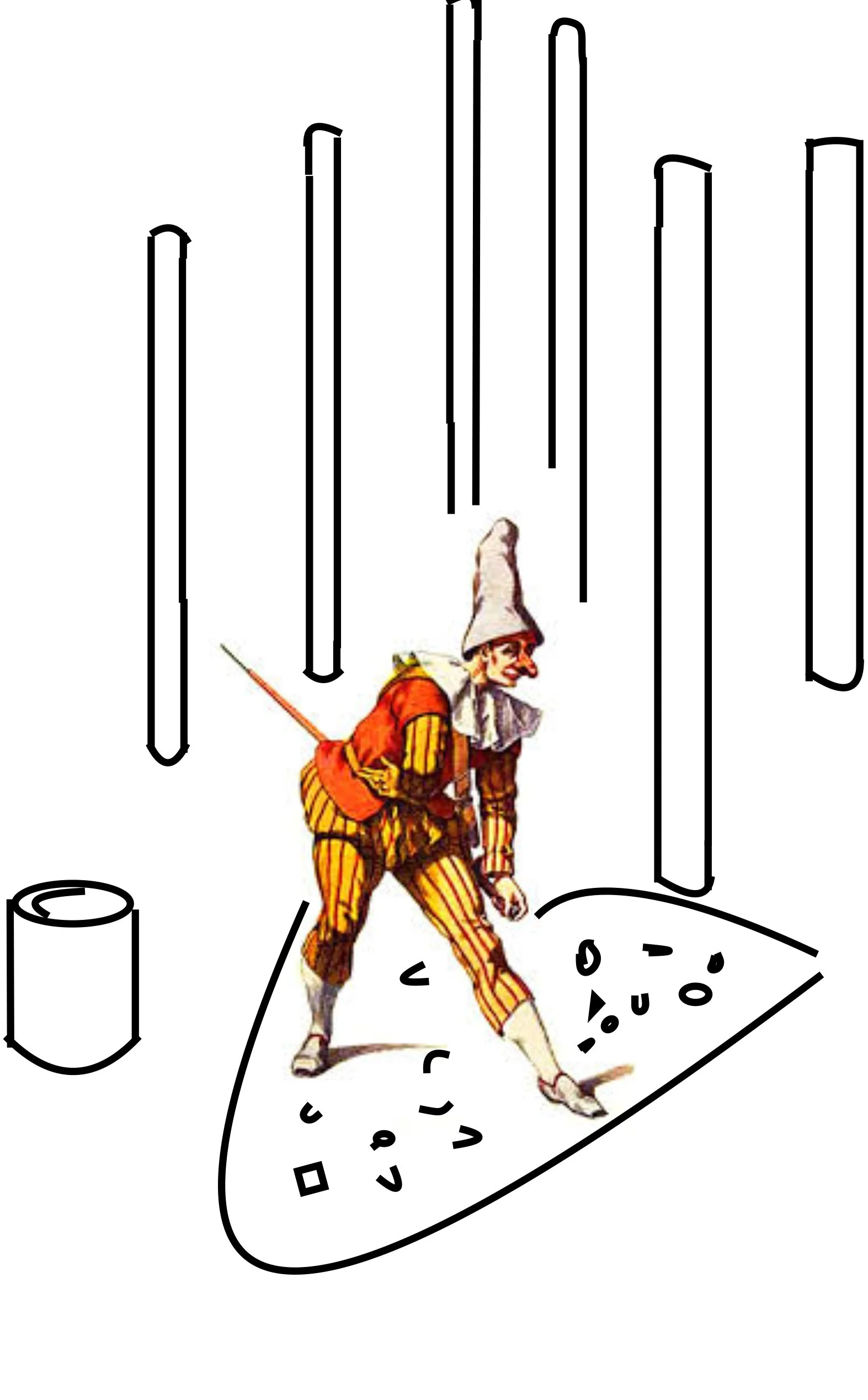An enchanted clustering of 250 telegraph poles; with differing degrees of density, allows visitors to progress through theatrical gaps between them, into the “wood”. The smaller the visitor the easier they’ll access clearings. These framing poles will be set into the ground with metal casings to protect the timber at its base. At various heights of these poles, timber rods will be knocked through drilled holes- to form armatures that “branch” to hold a canvas flag/pennant and activists’ stuff. These “props”, animate the space. The coloured areas on the ground shall be “stages” of painted shingle and pebbles; when wet, these also come to life. Carving these timber poles will not be prohibited, nor shall hanging objects from them, nor “tagging” them, nor performance. But they will be left as exposed timber to create a more natural feel- not fully painted. Shadows cast and situations acted in line with seasons and day times- will demarcate alignments. There will be several moveable seats of cut stouter poles- variously gathered for the viewers of this theatre. There will be solid timber benches fixed at key areas. Additional appendages will be fixed onto the poles in the future as extra props accumulate– lighting, plant pots, bird houses, padlocks, plant pots, pictures or screens; when budgets allow. Here the urban dweller experiences the city as theatre and the sky and clouds afresh as eyes are guided upwards towards the flags and beyond expansively from the clearings within this little maze-like forest stage set.